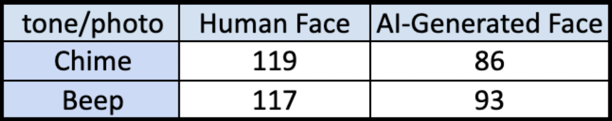 The study’s results did not support our hypothesis that an auditory primer will impact a participant’s perception of faces presented to them. While there was a significant difference in the number of “human” guesses rather than “AI”, there was no measured interaction between the tone of the auditory primer and the type of face classification produced as a result.